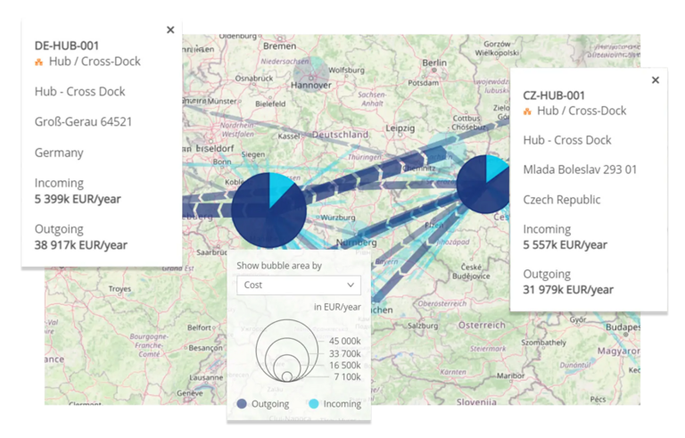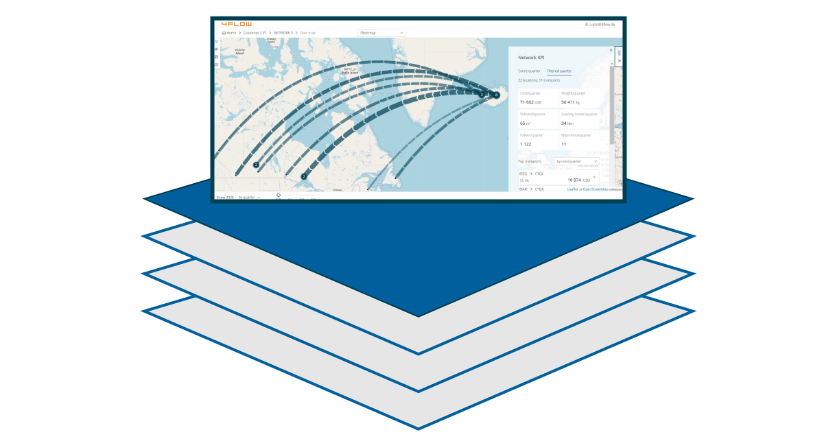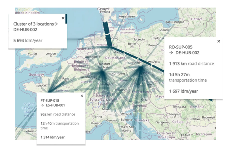4flow VIA仅需两类数据输入,即可启动网络建模、分析与优化。这意味着该软件适用于大多数企业,即使您仅有网络站点地址和近几周的货运数据,依然可以使用该软件。如果您有更多数据,还可新增数据类型,从而获取更全面的结果。