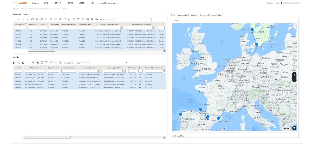 4flow iTMS 可搭建真正的控制塔设置,因其能将所有工厂及区域的运输规划、执行与优化功能集中在一个平台上。您可以通过单一视图管理所有货运任务、运输路线及站点,实现端到端可见性,助力更快制定决策,推动整个网络的无缝协作。
