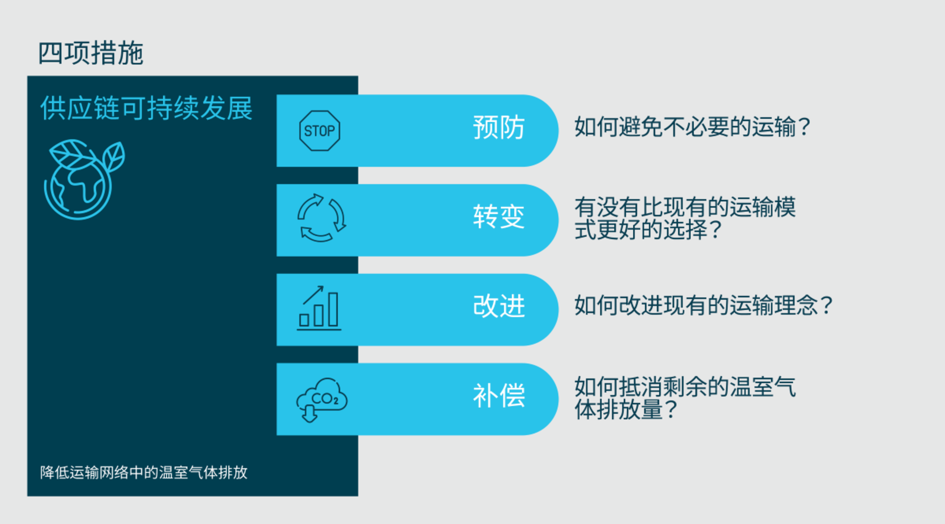 为了减少运输网络中的温室气体排放,企业可以采取一些关键措施。根据国际环境管理协会(IEMA)温室气体管理层次的一般规则,即消除、减少、替代和补偿碳排放,4flow建议采取以下 4 项措施: